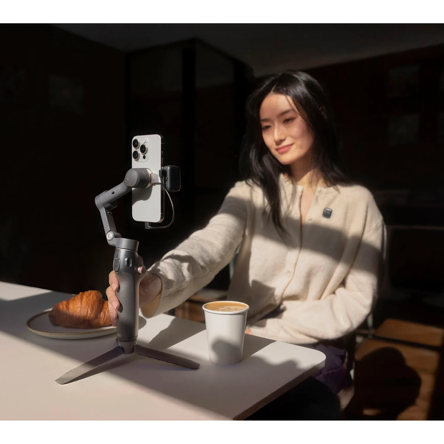 The Multifunctional Module adds tracking in your smartphone’s native camera app or third-party camera apps without requiring the Mimo app. Attaching the module also unlocks gesture control for hands-free adjustments. An integrated fill light on the module can enhance your low-light shooting. Bluetooth built into the module can connect up to two DJI Mic Mini transmitters to the gimbal without requiring a receiver unit.