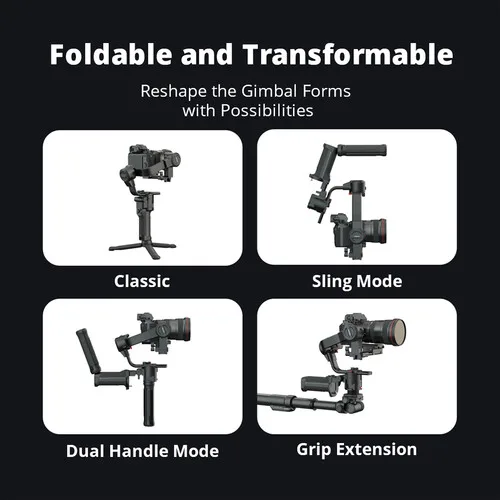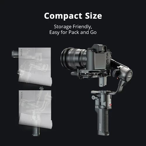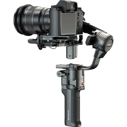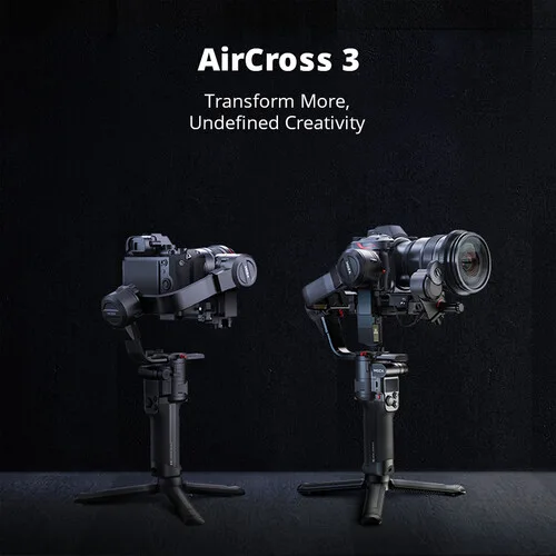 With an updated compact and ergonomic design from its predecessor, the Moza AirCross 3 3-Axis Handheld Gimbal Stabilizer features enhanced battery life, updated OLED UI, a single start/stop/shutter button, a more durable metal construction, greater stability, enhanced manual control, and a foldable design. The AirCross 3 supports cameras that weigh up to 7 lb, which can be set up in different configurations: Classic mode, Sling mode, and Dual-Handle mode, and can be used with a grip extension such as the optional Slypod for a dolly effect.